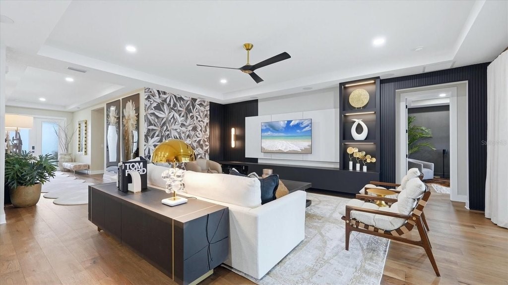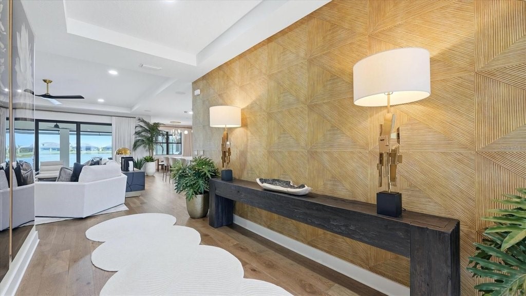 Welcome to an exceptional residence in the highly sought-after community of Solstice at Wellen Park, where luxury, comfort, and thoughtful design come together seamlessly. As you enter through the grand double doors, you are welcomed into an impressive entry hall that immediately sets the tone for the elegance and detail carried throughout the home. This stunning residence offers 4 bedrooms, 3 full baths, and a half bath, along with a spacious 3-car garage, all curated with impeccable attention to detail. From the moment you step inside, you'll notice elevated 8-foot doors, coffered ceilings, and a refined interior featuring custom wood cabinetry, built-ins, designer wallpaper, and tailored finishes throughout. Designed for both everyday living and elevated entertaining, the home includes a built-in wall unit, in-home theater with surround sound, and a central vacuum system for modern convenience. Each of the four bedrooms features custom-designed closets, while all bathrooms showcase custom mirrors and high-end finishes. Custom blinds and window treatments complete the home with style and sophistication. Step outside to your private retreat-over 1,600 square feet of outdoor living space designed to impress. The heated, saltwater pool takes center stage with a fully equipped outdoor kitchen and expansive entertaining areas. All of this is perfectly positioned to capture a breathtaking pond view, creating a serene and picturesque backdrop. Recent enhancements include new landscaping, upgraded lighting, and an extended walkway, further elevating the home's curb appeal. For peace of mind, the property is equipped with hurricane shutters, a generator, and a Halo whole-home water filtration system. Every inch of this home has been thoughtfully curated to deliver a true luxury lifestyle. Offered with the possibility of being furnished, this is a rare opportunity to move right into a beautifully completed home without compromise. Living in Solstice at Wellen Park means enjoying resort-style amenities, including a pool, clubhouse, pickleball and tennis courts, fitness center, dog park, and tot lot, everything you need for a vibrant and active lifestyle. Conveniently located and just a golf cart ride to downtown Wellen Park, near local beaches, Venice shopping and dining, Atlanta Braves Spring Training Facility, I-75, and area airports. Experience refined Florida living at its finest-this is more than a home, it's a statement.